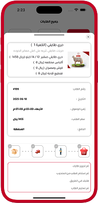 يوفر التطبيق قسمًا خاصًا يعرض فيه جميع الطلبات السابقة التي قام بها المستخدم، مع تفاصيل مثل نوع الذبيحة، طريقة التقطيع، وقت التوصيل، والمبلغ المدفوع